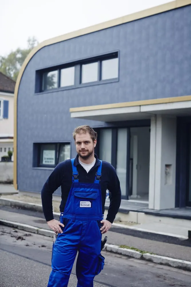 Gebaut hat der Spengler das Doppelhaus mit Metallhülle aber nur für sich. Entworfen und gebaut hat der Spengler das Doppelhaus mit Metallhülle aber nur für sich. „Es ist eine Art Experiment“, erklärt er. „Ich wollte ein Haus schaffen, das mich überdauert, keine laufenden Kosten produziert und zeigt, wie effektiv Metallfassaden sind.“ Aus dem Projekt kann der Meister so für die Zukunft lernen. Ein klassischer Fall von Learning by Doing. Gleichzeitig lebte er seine kreative Ader aus. „Wie mein Lehrer in der Berufsschule schon immer zu sagen pflegte, der Spengler ist ein Künstler. Das sehe ich auch so. Spengler sind Querköpfe. Wir sind alle ein bisschen exzentrisch“, sagt Michael Schrodt über sein Handwerk.