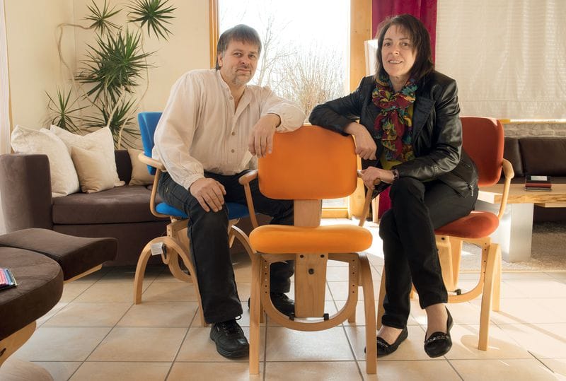Die „Stühle von der Stange“ bestehen aus heimischen Hölzern wie Buche und kommen von der Moizi Möbel GmbH aus Brakel. Der Handwerksbetrieb aus dem 60 Kilometer nördlicher gelegenen Heyen stellt dann die Lehne, das Schwingungsverhalten sowie die Höhe und Federfestigkeit individuell auf die Kunden ein. „Hierbei kommt es auf meine Erfahrung als Handwerker und den direkten Draht zum Endkunden an“, sagt Diekmann. „Die Industrie liefert sozusagen die Basis und wir den Markt.“ Gesund sind die Stühle, weil das dynamische Sitzverhalten die Muskeln trainiert, den Rücken entlastet und Verspannungen vorbeugt.