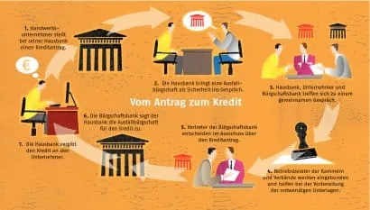 Abhilfe schaffen hier Bürgschaften und Garantien der regionalen Förderinstitute (siehe Grafik und Kasten Seite 67). Wenn einem Handwerksbetrieb Sicherheiten für Investititionen fehlen, steigt die Bürgschaftsbank in die Finanzierung ein und sichert den Kredit für das Finanzinstitut ab. Übernimmt das Förderinstitut das Ausfallrisiko für die Hausbank, hat der Unternehmer bei Kreditverhandlungen deutlich bessere Karten.