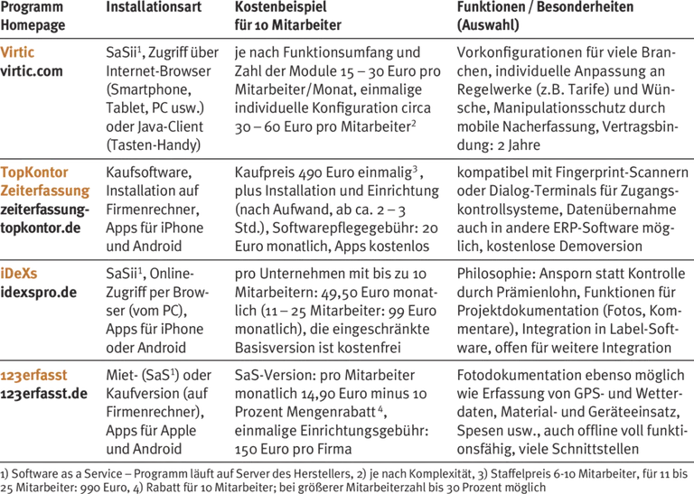 Miete oder Kauf? Speicherung auf dem Firmenrechner oder in der Cloud? Einzelsystem oder Zusatzbaustein zur Firmensoftware? Lösungen zur Zeiterfassung gibt es in zahlreichen Varianten. Hier eine Auswahl von Systemen mit im Handwerk bewährten Modulen samt Kostenvergleich.