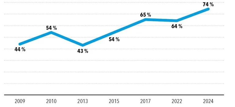 Mit 74 Prozent nennen drei Viertel der Befragten die Bauwirtschaft als eine wichtige Branche für Deutschland. Damit ist die Bauwirtschaft auf Platz drei vorgerückt, hinter Autoherstellern (83 Prozent) und dem Handwerk (78 Prozent). Das sind zehn Prozentpunkte mehr als 2022 und 30 Prozentpunkte mehr als 2009.