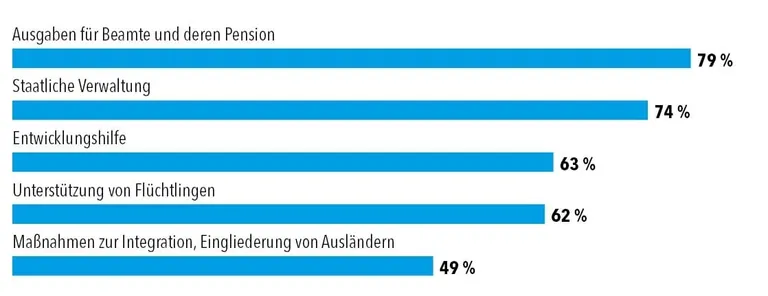 Vor allem bei den Ausgaben für Beamte und deren Pension sehen die Befragten ein Sparpotenzial. - © Quelle: Allensbacher Archiv, IfD-Umfragen 12052 und 12084/IfD-Allensbach