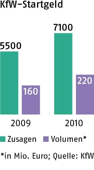 Die Förderung ist ein Erfolgsmodell: 2010 bewilligte die KfW das Startgeld 7100-mal mit einem Gesamtvolumen von 220 Millionen Euro. Insgesamt hält die KfW sieben Förderprogramme für Gründer bereit, Bund, Länder und EU weitere 200