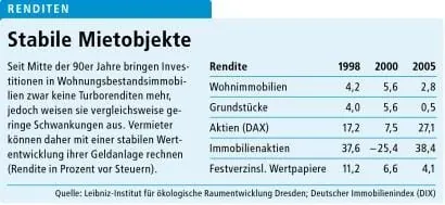 Nach einer Studie des Leibniz-Instituts für ökologische Raumentwicklung in Dresden im Auftrag des Bundesamtes für Bauwesen und Raumordnung in Bonn verbuchen nur 41 Prozent der befragten privaten Eigentümer Gewinne aus einer vermieteten Wohnung. Gute Potenziale sieht Andreas Stücke, Generalsekretär des Immobilienbesitzerverbandes Haus und Grund in Berlin, vor allem in prosperierenden Ballungsgebieten: „Wichtig ist, dass der Standort intakt ist.“
