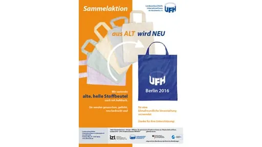 Im Rahmen der Abschlussveranstaltung des Projektes am 14.10.2016 wird der UFH diese klimafreundlich durchführen, zu der auch Sie beitragen können: Bestimmt besitzen auch Sie Stoffbeutel, häufig auch einige mehr, als Sie gebrauchen können. Anstatt die blauen Beutel mit dem UFH-Logo neu anfertigen zu lassen und dabei wertvolle Ressourcen zu verbrauchen, sammelt der UFH überzählige Stoffbeutel an zahlreichen Sammelstellen in Berlin, um sie neu einzufärben und zu bedrucken. Alle Stoffbeutel in hellen Farben, auch mit Aufdruck, werden in folgenden Sammelstellen gern entgegengenommen:
