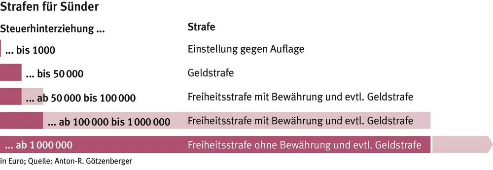 „Die Hürden dafür sind in den vergangenen Jahren deutlich herabgesetzt worden“, warnt Anton R. Götzenberger. Nach einem Urteil des Bundesgerichtshofs drohen Haftstrafen ohne Bewährung bereits, wenn mehr als eine Million Euro Steuern hinterzogen wurden. Ab 100000 Euro kommt es zu Freiheitsstrafen mit Bewährung (siehe „Bankgeheimnis“, Seite 14).