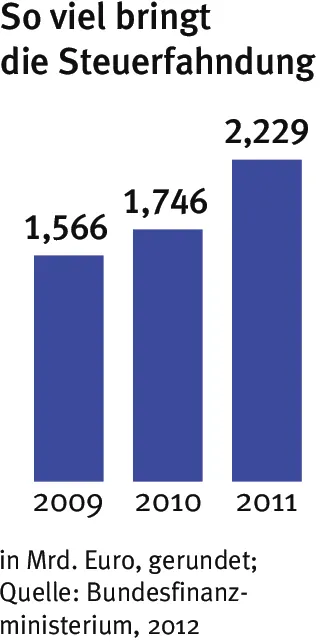 Die Steuerfahnder sind bei Steuerbetrug schnell bei der Hand (siehe „Razzia im Betrieb“, Seite 17). „Die Beamten stehen fast immer unangemeldet vor der Tür und durchsuchen gnadenlos die privaten oder auch die betrieblichen Räumlichkeiten“, sagt Steuerexperte Götzenberger. Nach der Auswertung der Daten-CDs oder – auch das kommt häufig vor – etwa anonymen Hinweisen sowie Kontrollmitteilungen anderer Finanzämter erfolgt im Regelfall im ersten Schritt ein Abgleich mit Steuerunterlagen. Stellen die Finanzbeamten Unregelmäßigkeiten fest, geht es los. Stoßen die Fahnder bei der Razzia dann auf steuerrelevante Unterlagen, die den Verdacht der Steuerhinterziehung bestätigen, drohen den Betroffenen im absoluten Extremfall einige Jahre hinter Gittern.