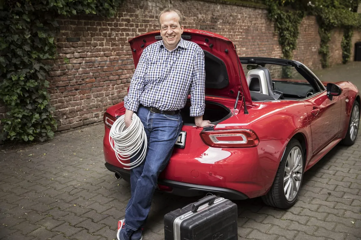 Elektriker Alexander Hübsch ist Spezialist für Smart Home, Ladenbau und Datennetzwerke. Der Privatmann Hübsch ist ein Freund des offenen Fahrens. In jungen Jahren fuhr er einen Jeep Wrangler Cabrio. Der Fiat mit seinem leicht nach hinten aufklappbaren Verdeck hat deshalb gute Karten, zumal dem 43-Jährigen die Karosse in „Passione Rot“ gut gefällt. Besser als die des Mazda MX-5, auf dem der Spider technisch basiert. Dennoch springt der Funke bei Hübsch zunächst nicht so über, denn die Erwartungen an das Temperament des Italieners halten sich in Grenzen.