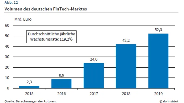 Die Vorteile der digitalen Finanzdienstleister werden Nutzern zunehmend bewusst. Das Marktwachstum beträgt im Schnitt der Jahre 2015 bis 2019 rund 119,2 Prozent jährlich, hat das Ifo-Institut errechnet.