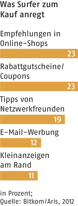 Dass sein Erfolg kein Zufall ist, belegt eine aktuelle Studie des Bundesverbands Informationswirtschaft und Telekommunikation (Bitkom) in Berlin. Danach haben sich 56 Prozent der Internetnutzer bereits durch eine Onlinewerbung zum Kauf oder zu einer Bestellung anregen lassen (siehe Chart rechts). In Kombination mit der Tatsache, dass sich 80 Prozent der Kunden bereits vor dem Kauf im Netz über Produkte und Anbieter informieren, entwickelt sich das Onlinemarketing zum wichtigsten Kundenbringer. Dabei hat sich die klassische Mundpropaganda laut Bitkom weitgehend in die Onlinewelt verlagert. Wurden früher noch Freunde und Nachbarn persönlich nach ihren Erfahrungen befragt, vertraut der moderne Konsument inzwischen auch gerne den Empfehlungen seiner Netzwerk-Freunde oder anderen Käufern eines Onlineshops.