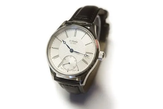 „Vor einigen Jahren war mir klar, dass ich mich neu orientieren muss. Ich empfand meinen Standort als schwierig und wollte Nischen suchen, etwas machen, was andere nicht können“, sagt Flüthe. Da kam eines Tages ein langjähriger Kunde in den Laden der seit 1859 in Familienbesitz geführten Uhrmachermeisterwerkstatt. In einer Schublade hatte er eine vergessene Taschenuhr gefunden, auf deren Zifferblatt das Markensignet „Flüthe“ prangte. Nach einigen Recherchen erfuhr Reinhold Flüthe, dass sein Urgroßvater eigene Uhren angeboten hat. „Ich habe mich gefreut, einem Stück Familientradition zu begegnen, und wollte unsere Hausmarke wieder aufleben lassen.“