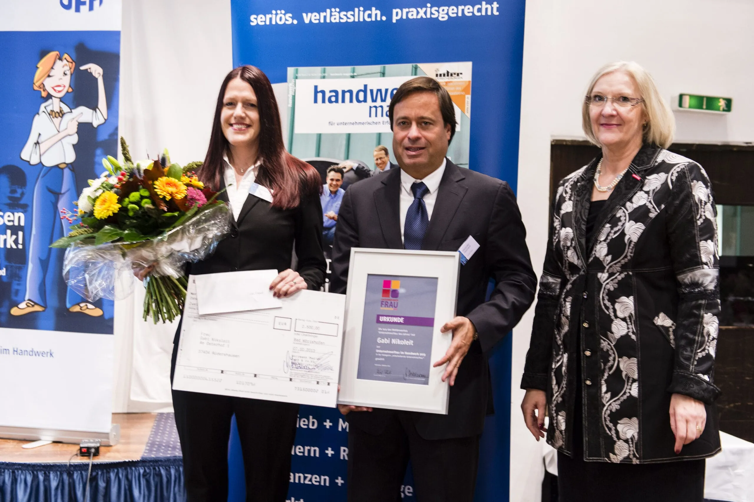 Scholz: Feierliche Preisübergabe an die „Unternehmerfrau 2013“ in der Kategorie „mitarbeitende Unternehmerfrau“: Gabi Nikoleit aus Rüdershausen (von li.) mit Verleger Alexander Holzmann und Heidi Kluth, Bundesvorsitzende der Unternehmerfrauen im Handwerk.