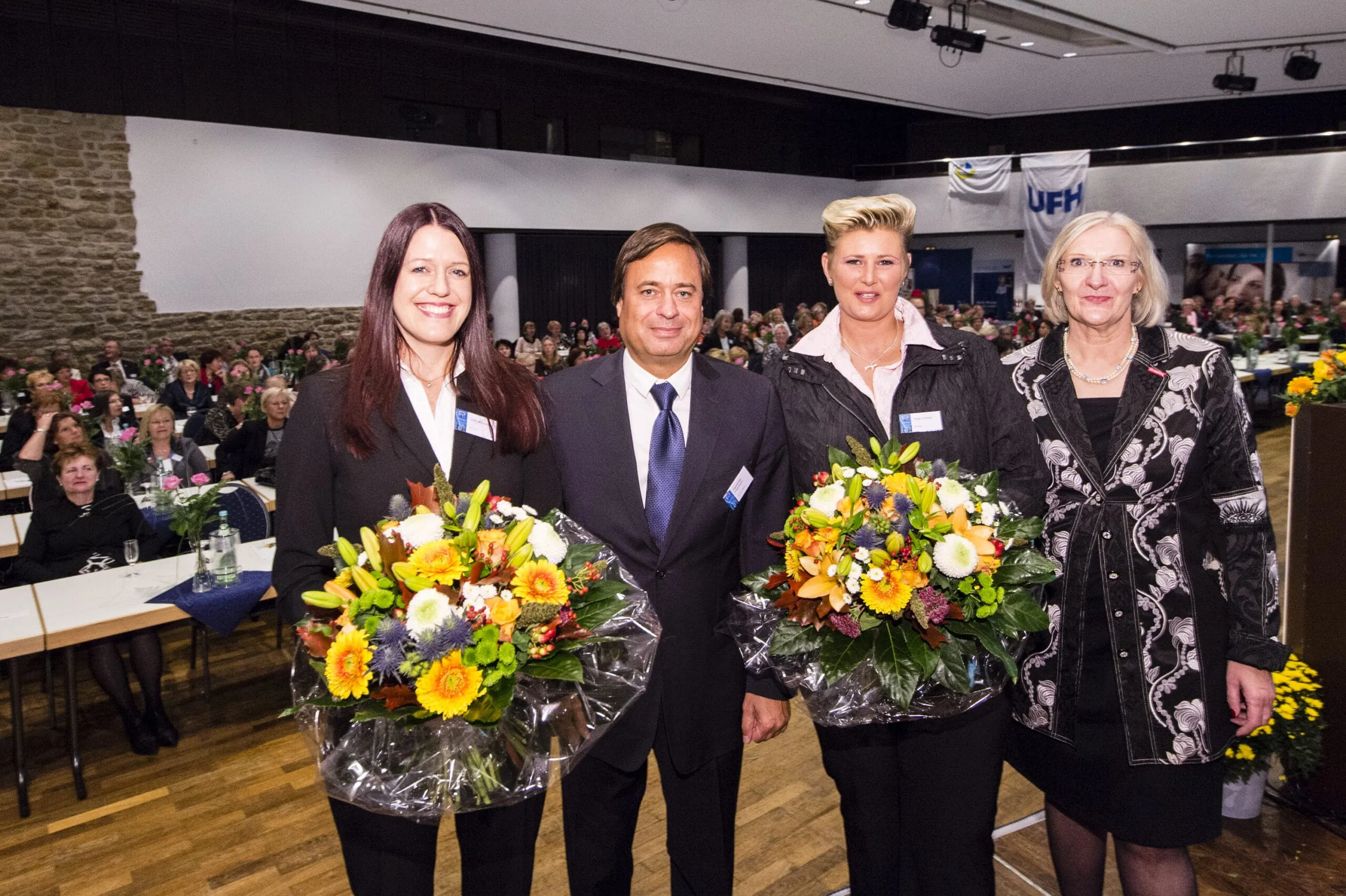 Die beiden Gewinnerinnen „Unternehmerfrau 2013“ mit ihren Paten auf der feierlichen Preisverleihung in Goslar: Gabi Nikoleit (von li.), Verleger Alexander Holzmann, Maja Scholz und Heidi Kluth, Bundesvorsitzende der Unternehmerfrauen im Handwerk.