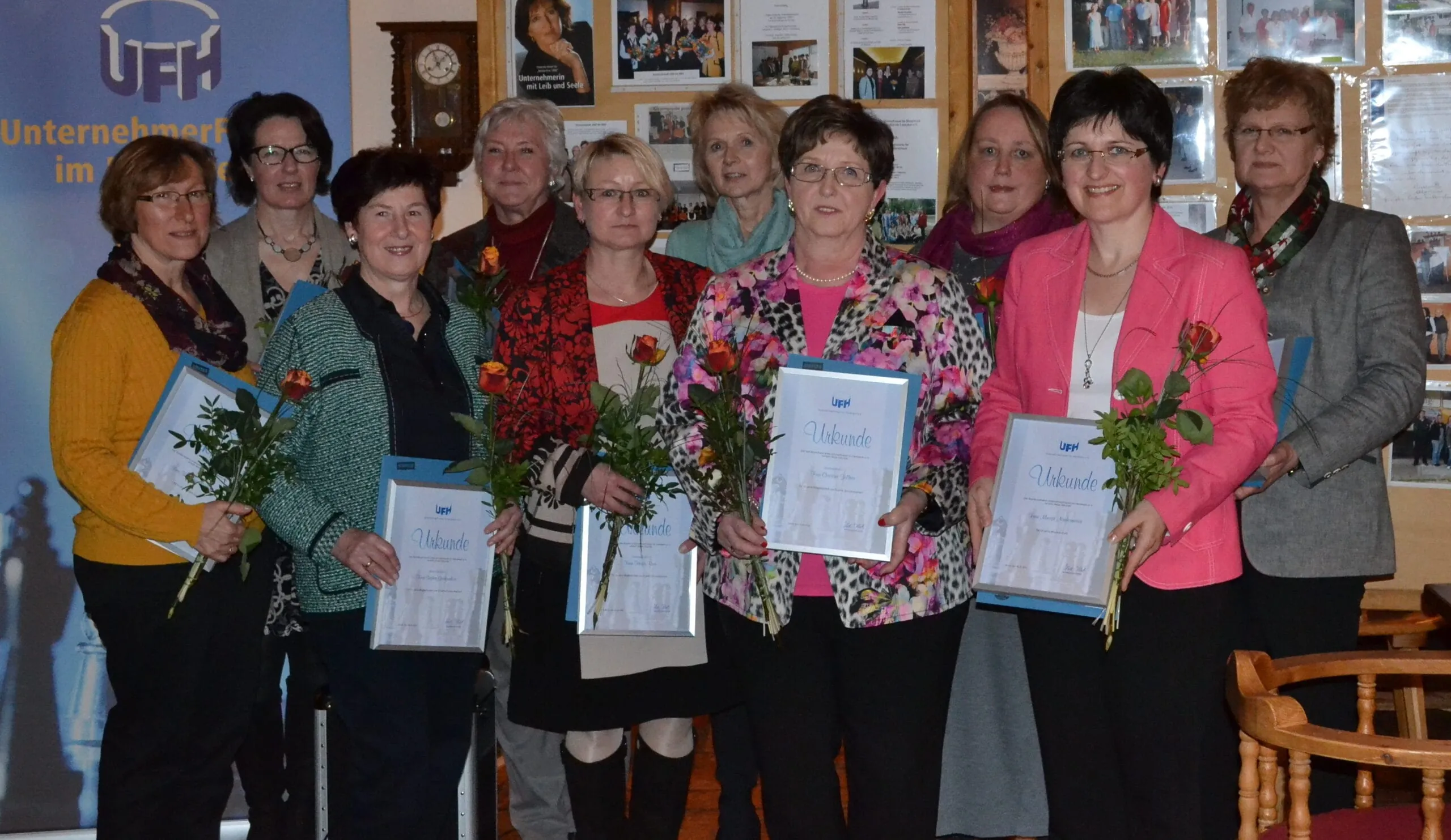 Lobende Worte für den Verein gab es schließlich noch von Kreishandwerkermeisters Alfred Kuttenlochner in seiner Ausführung. „Selten habe ich einen Verein gesehen, der so gut aufgestellt ist. Die reibungslose Wahl zeigt, dass hier gute Vorarbeit geleistet wurde. Es gefällt mir, wie aktiv die UFH-Frauen an Seminaren und Fortbildungen teilnehmen“, so Kuttenlochner. Als Unterstützung lud er die UFH-Frauen bei der nächsten Landshuter Hochzeit zur Bewirtung ins Bauzunfthaus ein. Zum Abschluss überraschte der Präsident der HWK Niederbayern/Oberpfalz Franz Prebeck die UFH-Damen noch mit einer Zusage einer „Präsidentenprämie“ beim Erreichen des 100. Mitglieds.