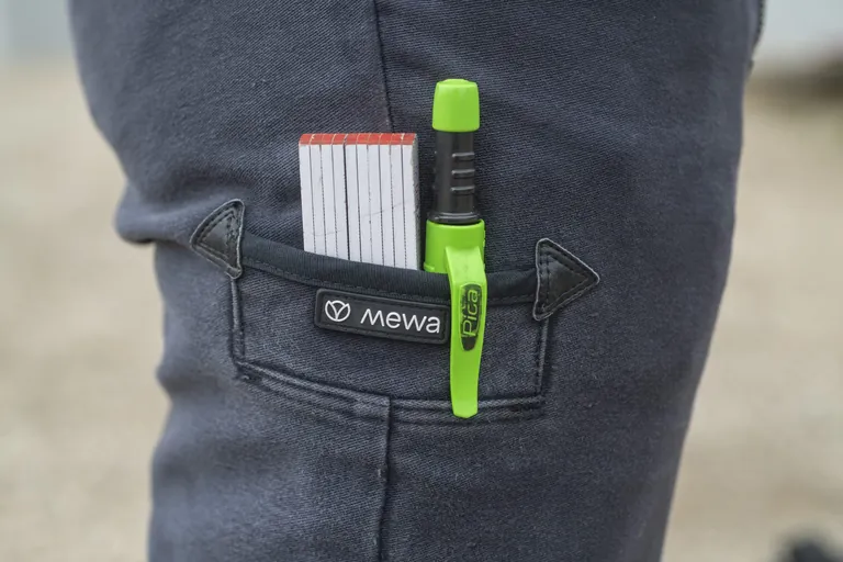 Die Zunfthose (Doppelpilothose) von Mewa ist aus glattem Stoff. Die Seitentaschen halten den Zollstock und Stift.