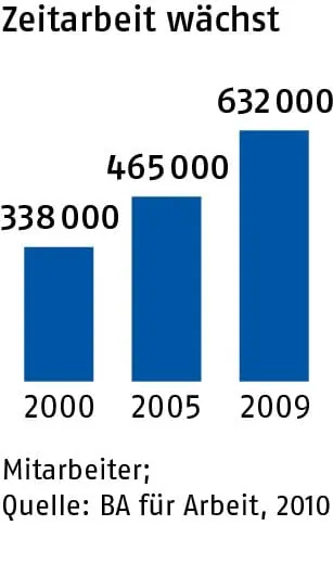 Vor ein paar Jahren dachte Hermann Stolz, von der Hermann Stolz Sanitär- und Heizungstechnik in Mühlheim an der Ruhr noch nicht daran, dass sein Betrieb einmal Zeitarbeiter brauchen würde. Zwar gab es in der Drei-Mann-Firma mit 280000 Euro Jahresumsatz auch Terminengpässe. Doch auf die Idee Leiharbeitnehmer kam Stolz nicht. Bis eines Tages ein Zeitarbeitsunternehmen sein Angebot bei ihm vorstellte. Jetzt füllt er Personallücken mit Zeitarbeit, „einmal im Jahr mit ein bis zwei Leuten für 14 Tage“ - so kann er seine Termine halten.