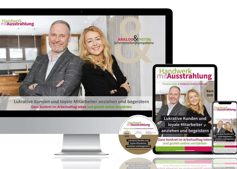 Aus der langjährigen Zusammenarbeit zwischen der Spezialistin für Servicekultur im Handwerk, Umberta Andrea Simonis (siehe handwerk magazin-Experten), mit dem Internet-Marketing Profi fürs Handwerk, Thomas Issler, ist zu diesem Thema ein mehr als zweistündigen Video-Praxis-Kurs entstanden, der anschaulich in sieben Schritten das Beste aus beiden Welten vermittelt. Der Kurs enthält sofort umsetzbares Praxis-Know-How, zusätzlich Erfolgsgeschichten, Interviews und reale Erfolgs-Beispiele von Handwerksunternehmen. Das Ganze ist als DVD sowie über einen Online-Zugang erhältlich. Der reguläre Preis beträgt 235 Euro (Abonnenten von handwerk magazin erhalten 20 Prozent Rabatt) – und ist über den Holzmann Medienshop zu erwerben.