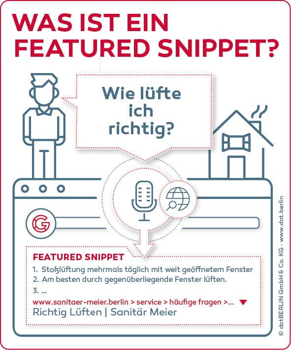 Websites, die eine Chance haben, Position 0 einzunehmen, machen es Nutzern leicht, eine Lösung für ihr Problem zu finden. Wer also zum Beispiel wissen möchte, wie richtiges Lüften und Heizen funktioniert, wird seine Antwort von einer Website bekommen, die genau das Schritt für Schritt erklärt. Handwerksbetriebe, die Internetnutzern auf diese Weise einen Mehrwert bieten möchten, können gut mit einem FAQ-Bereich auf der Website arbeiten, der häufig gestellte Fragen bündelt. Sinnvoll sind auch Blogbeiträge, denn hier ist es möglich, zusätzlich weiterführende Informationen anzubieten. In jedem Fall sollte es der Suchmaschine leicht gemacht werden, einzelne Informationen ausfindig zu machen und zu übernehmen – Absätze, Zwischenüberschriften, Listen und Stichpunkte helfen dabei.