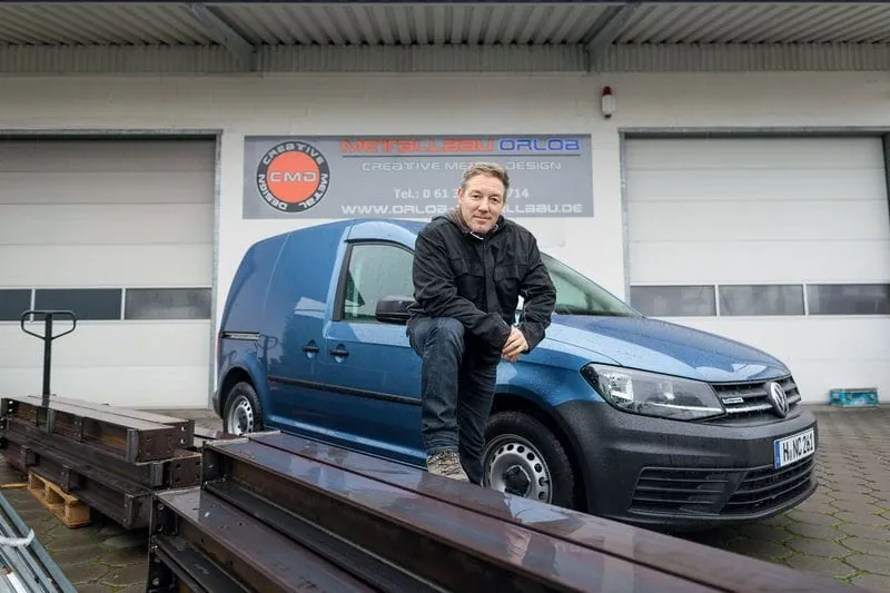 Trotz der vollen Auftragsbücher nimmt sich der Chef Zeit für eine Ausfahrt im VW Caddy. Die Tour geht durch Mainz-Kastel, einen ehemaligen Mainzer Stadtteil, der seit Langem schon zu Wiesbaden gehört. Hier hat Orlob im Jahr 1998 seinen Betrieb gegründet. Der Standort ist geblieben, die Werkstatt ist im Laufe der Jahre mit steigender Mitarbeiterzahl immer größer geworden. Bei der Testfahrt prüft Orlob den Caddy auf Herz und Nieren, tritt zwischendurch kräftig aufs Gas. „Alles noch so neu“, lobt Orlob. Das Lenkrad sei sogar ein bisschen zu glatt. Trotzdem zeigt sich der Metallbaumeister insgesamt überzeugt von dem Auto.