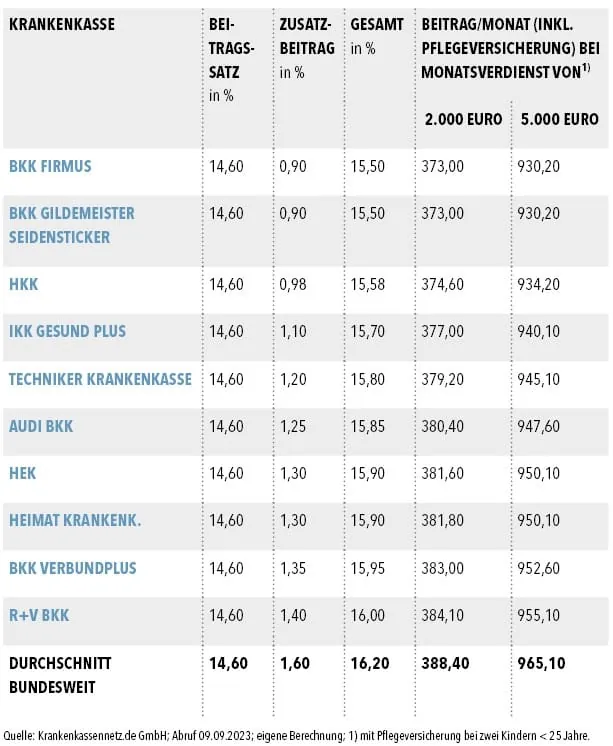 Diese gesetzlichen Krankenkassen sind bundesweit tätig und erheben einen relativ geringen individuellen Zusatzbeitrag für Selbstständige. Der Krankengeldanspruch beginnt mit dem 43. Tag der Krankschreibung.