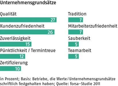 Mit dieser Werteskala liegen die Volkmars exakt auf der Linie des gesamten Handwerks, denn handwerk magazin hat zusammen mit ZDH-Zert, der Zertifizierungsstelle der Handwerksorganisation, sowie der Gesellschaft für Sozialforschung und statistische Analysen (forsa) aktuell und exklusiv 502 Handwerksunternehmen nach ihren Werten und ihrer Unternehmenskultur gefragt. 27 Prozent haben die Qualität konkret als Wert oder Grundsatz festgelegt, 26 Prozent die Kundenzufriedenheit und 15 Prozent die Zuverlässigkeit (siehe Grafik oben). Diese unternehmerischen Grundsätze werden in den meisten Handwerksbetrieben gelebt. „Konkret formulierte Leitbilder hat aber nur eine Minderheit des Handwerks - und wenn, dann nur in eher allgemeiner und vager Form“, hat Manfred Güllner, Leiter von forsa, herausgefunden. Nur 34 Prozent der befragten Handwerksbetriebe, besonders die größeren, haben ihre Werte und Grundsätze im Sinne eines Leitbildes schriftlich niedergelegt. Davon haben zehn Prozent ihr Managementsystem zertifizieren lassen.