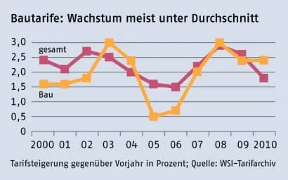 Am Bau, wo die Branche sich mit fünf Prozent in zwei Jahren gerade auf einen vergleichsweise üppigen Anstieg der Tariflöhne verständigt hat, scheint diese Einstellung bislang noch nicht zu gelten. Norman Walther, Geschäftsführer der „Deutschen Handwerkervermittlung“ (DHV) in Berlin, hat unter seinen Kunden auch viele klein- und mittelständische Baubetriebe: „Von Tarif ist da kaum die Rede, die meisten zahlen nach wie vor den Mindestlohn.“