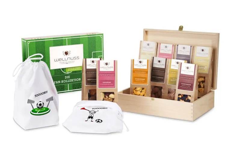 Die Baumwoll-Säckchen im Fußball-Outfit von Anbieter Wellnuss in Hamburg (Preis: 9,95 Euro) enthalten Nuss-, Trockenfrucht- und Schokoladenkompositionen aus hochwertigen Rohstoffen in naturbelassener Qualität. Besonders geeignet für lange brasilianische Fußballnächte sind die Varianten „Glücksbringer“ (Trüffelmandeln in Kakao) und „Energiespender“ (Cranberries und Edelnüsse).