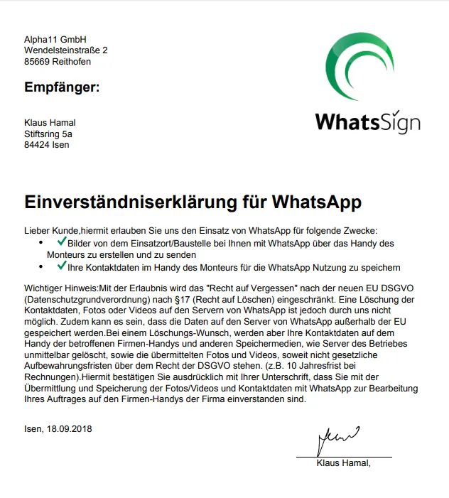 In WhatsSign können neben der WhatsApp Einwilligung auch noch andere Unterschriften vom Kunden eingeholt werden, ein Auftrag bestätigt oder Mehraufwand akzeptiert werden. Die Vorarbeiter nutzen ebenfalls WhatsApp Business - teilweise in der Box und teilweise ohne. Je nachdem, ob sie ausschließlich WhatsApp-Kontakte in der Kontaktliste haben oder auch welche ohne Einwilligung und ohne WhatsApp. Zwei iPhones in der Firma arbeiten mit Secure Contact, da es die WhatsBox aktuell nur für Smartphones mit Android-System gibt. Jeder Mitarbeiter, Vorarbeiter und Arbeiter, hat eine Einwilligung abgegeben und eine Verschwiegenheitsverpflichtung nach DSGVO unterschrieben.