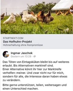 „Mein Kumpel @hofhuhn hat was Krasses vor“, schreibt die Metzgerei Lappen und Prengel in ihrem Instagram-Beitrag. „Dafür braucht er eure und meine Unterstützung✊“ Es geht um das Hofhuhn-Projekt, das Ingmar Jaschok ins Leben gerufen hat – um die Tötung von Eintagsküken zu verhindern.