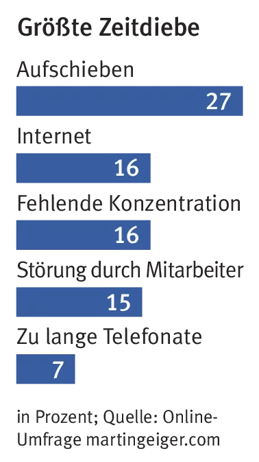 Neben der Strategie lernen Unternehmer bei Anbietern wie Helfrecht, Schmidt Colleg, Tempus & Co. auch, wie sie ihren Alltag effektiver organisieren. Eine der wichtigsten Grundregeln dabei: nie den Tag komplett vollpacken, sondern immer genügend Luft für unvorhersehbare Aufgaben einplanen. Fast genauso entscheidend ist es, klare Prioritäten zu setzen (siehe oben) und als Chef Aufgaben zu delegieren. Denn die Chefarbeitszeit ist besonders teuer und wertvoll, was andere besser und vor allem preiswerter können, sollten sie schon aus betriebswirtschaftlichen Gründen auch übernehmen (siehe Rat nächste Seite).