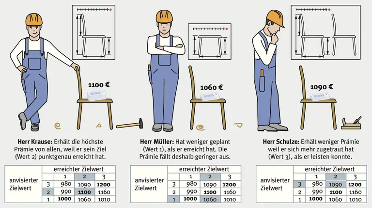Neben der variablen Vergütung nach Gewinn und Verantwortung des Mitarbeiters bietet sich im Handwerk auch eine variable Vergütung nach gesetzten Zielen an. Dieses System wirkt motivierend, weil der Mitarbeiter dafür belohnt wird, ehrgeizig und doch realistisch zu planen.
